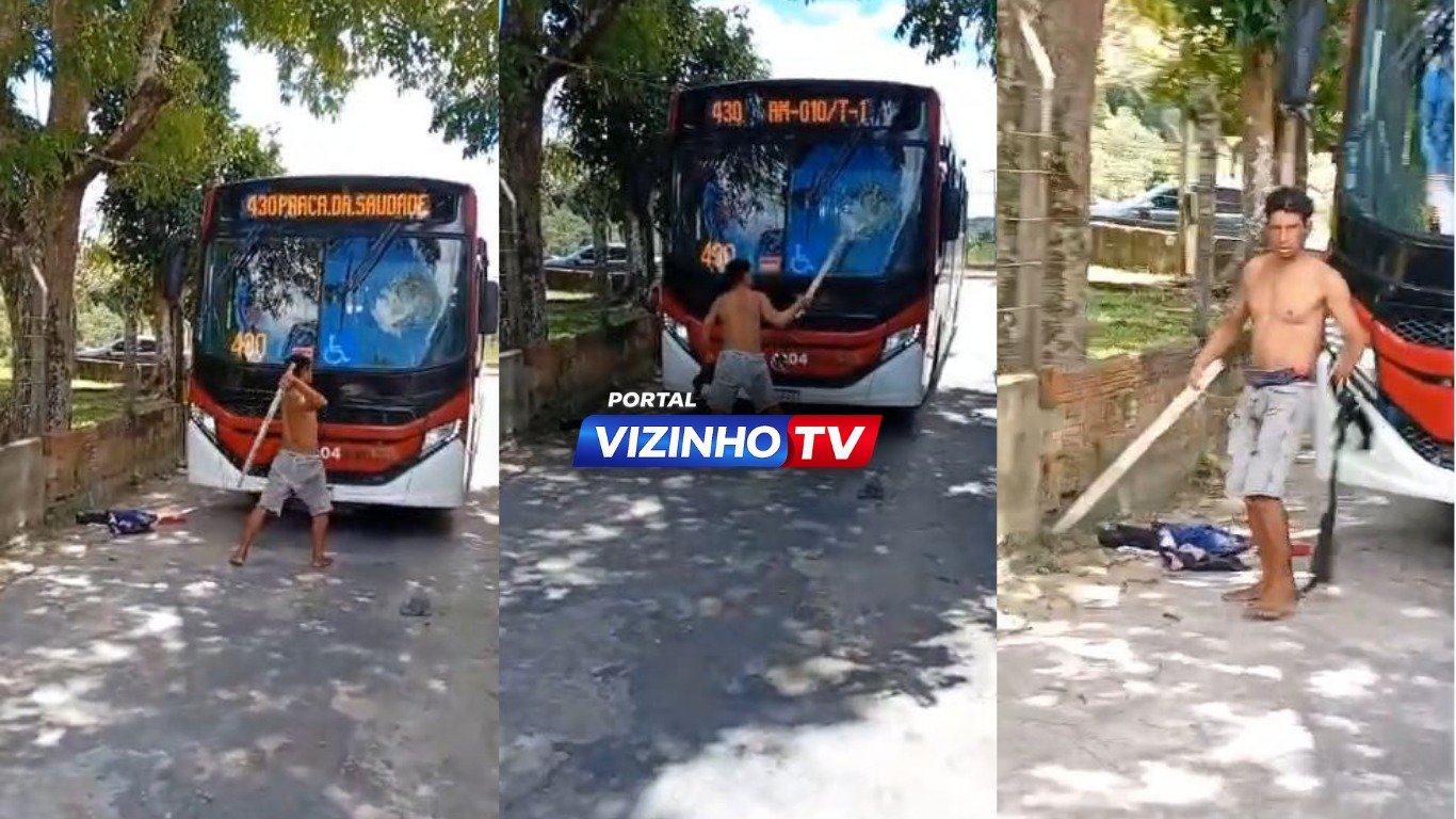 “Curupira da Pedra” surta, parte pra cima e destrói ônibus da linha 430 a pauladas em Manaus; veja vídeo