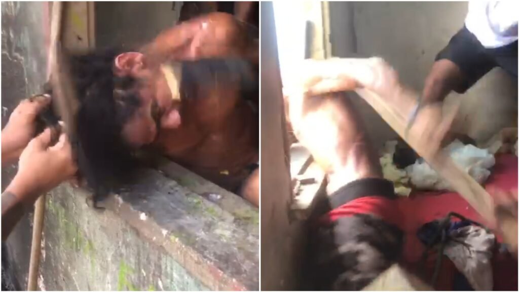 O vídeo mostra a vítima com o corpo parcialmente exposto por uma janela. Do lado de fora, dois homens o puxam violentamente pelos cabelos, enquanto dentro do imóvel outros agressores o atingem repetidamente com pedaços de madeira. Um dos agressores é ouvido gritando “é para quebrar o braço dele”, evidenciando a intenção de causar sérios danos físicos à vítima.