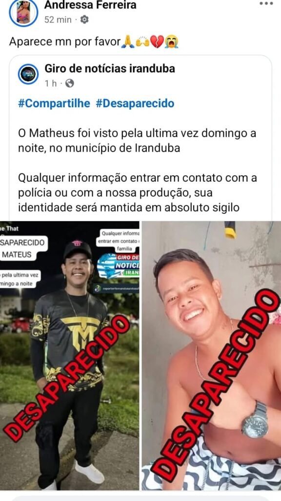 O jovem Matheus foi encontrado morto nesta sexta feira (4) no município de Iranduba, Região Metropolitana de Manaus. Ele estava desaparecido desde o último domingo (31), quando foi visto pela última vez em uma casa de show da cidade.