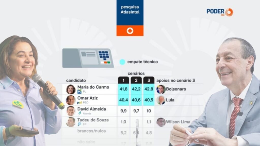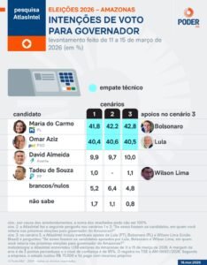 POLITICA – A corrida pelo Governo do Amazonas em 2026 começa marcada por forte equilíbrio e clima de incerteza. Pesquisa da AtlasIntel, divulgada nesta quarta-feira (18 de março), revela um cenário de empate técnico entre o senador Omar Aziz (PSD) e a empresária Maria do Carmo Seffair (PL), tanto no primeiro quanto no segundo turno.