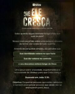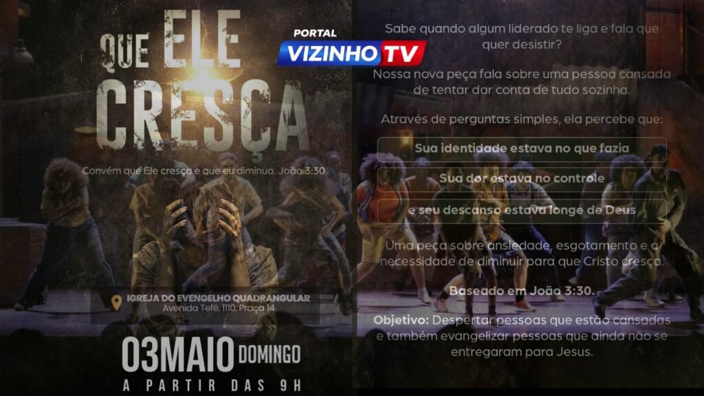 Com cenas intensas e uma linguagem que toca diretamente o coração, “Que Ele Cresça” aborda temas urgentes como ansiedade, esgotamento emocional e vazio interior — questões cada vez mais presentes na sociedade atual. Inspirado no versículo bíblico de Evangelho de João 3:30, o espetáculo traz uma mensagem poderosa: é preciso diminuir para que Cristo cresça, reconhecendo limites e redescobrindo a verdadeira paz.