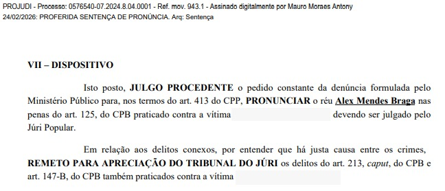 A decisão de pronúncia foi assinada nesta terça-feira (24) pelo juiz Mauro Moraes Antony. Nessa fase processual, não há condenação, mas apenas o entendimento de que o caso deve ser submetido ao julgamento popular, competente para analisar crimes dolosos contra a vida.