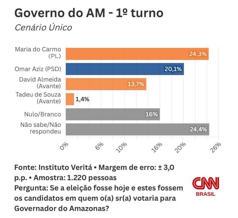 A pesquisa de repercussão nacional do instituto Veritá confirma o crescimento da pré-candidatura ao governo da Professora Maria do Carmo (PL) junto ao eleitor amazonense. Divulgado nesta sexta-feira, 27/3, pela CNN Brasil, um dos veículos de comunicação mais respeitados do mundo, o levantamento mostra Maria do Carmo com 24,3% das intenções de voto contra 20,1% de Omar Aziz. Dentro da margem de erro, os dois estão tecnicamente empatados em primeiro lugar.