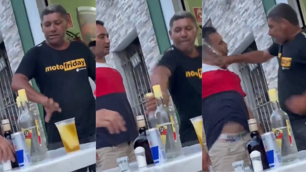 A confusão começou quando dois homens discutiam dentro do bar. Um deles, visivelmente alterado, provocava o outro — um homem de cerca de 50 anos. O agressor jogou um copo no chão, bateu na mesa e tentou iniciar uma briga. Em um momento de distração, o homem mais velho pegou uma garrafa da marca 51 e acertou um golpe direto no rosto do provocador, encerrando o confronto.