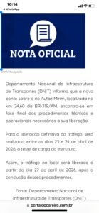 Diante da forte pressão popular e da ampla repercussão do caso, o Departamento Nacional de Infraestrutura de Transportes se pronunciou oficialmente e informou que a estrutura será finalmente liberada para o tráfego no próximo dia 27 de abril.