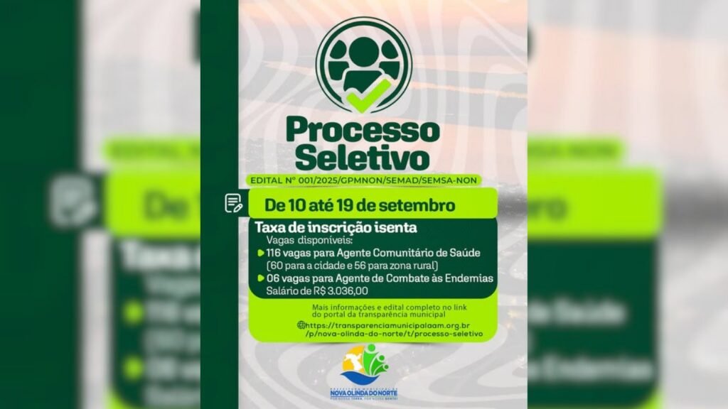 A Prefeitura de Nova Olinda do Norte anunciou a abertura do Processo Seletivo Público 2025, regulamentado pelo Edital nº 001/2025, para contratação de Agentes Comunitários de Saúde (ACS) e Agentes de Combate às Endemias (ACE).