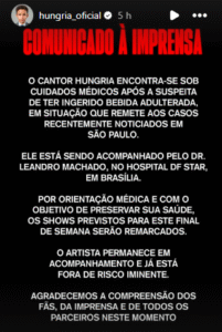 Em comunicado nas redes sociais, a equipe de Hungria tranquilizou os fãs, afirmando que o artista está fora de risco iminente. A agenda de shows do fim de semana foi cancelada.