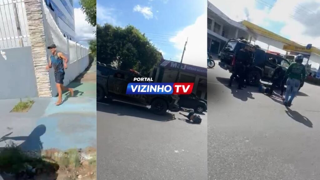 Imagens gravadas por testemunhas mostram o momento exato em que o suspeito tenta escapar, mas é interceptado pelos agentes. A ação rápida dos policiais termina com o homem no chão, imobilizado.